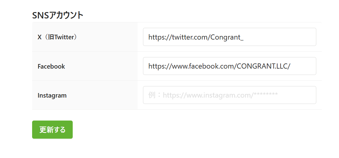 よりX・Facebook・Instagramアカウントの設定が可能です。
