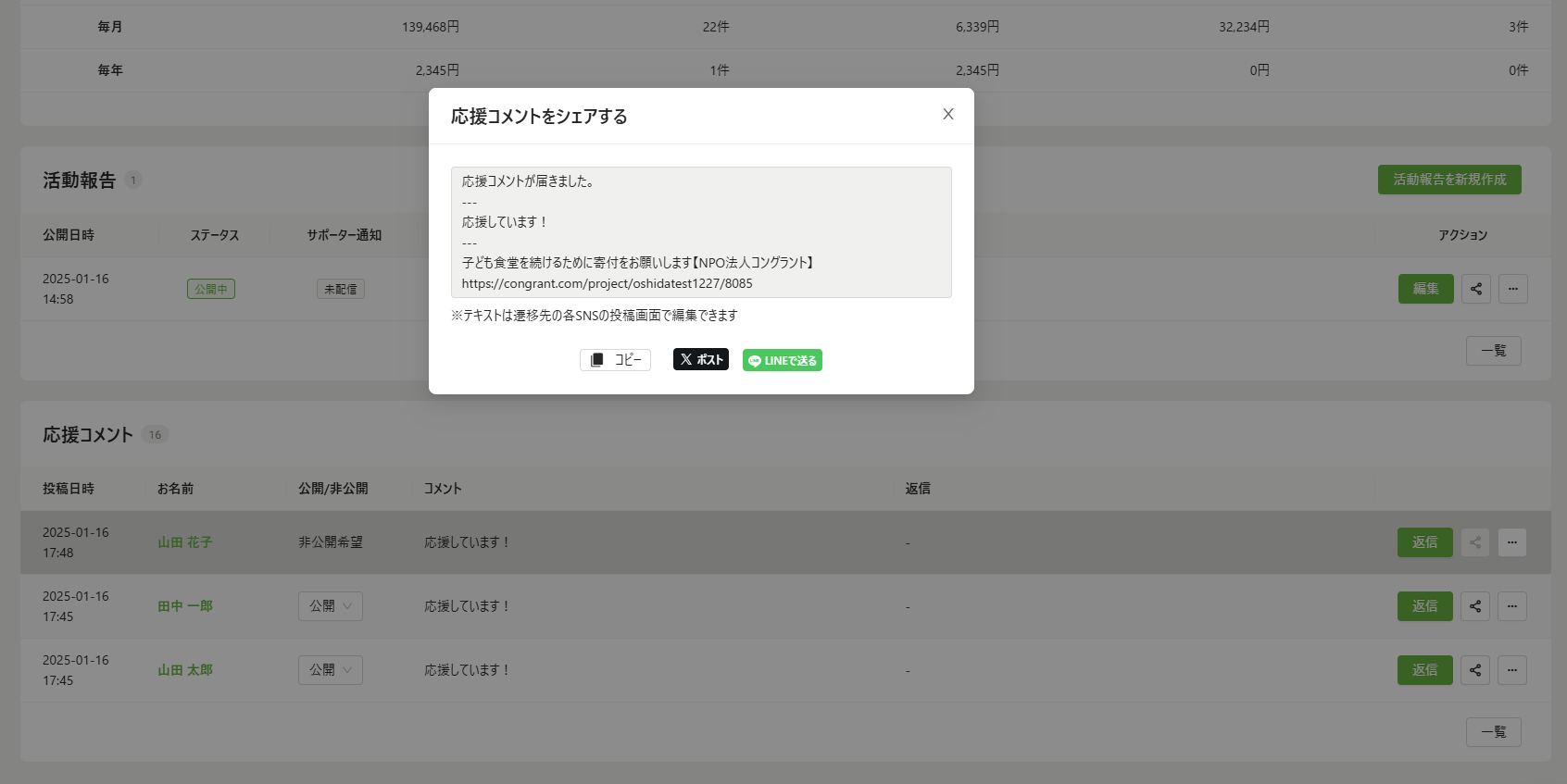 【2025/01/16】領収書PDF内の団体名を編集可能に・活動報告と応援コメントのシェア機能 etc…
