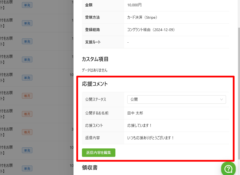 今回のアップデートで、決済詳細画面で決済レコードに紐づく応援コメントを確認できるようになりました。
