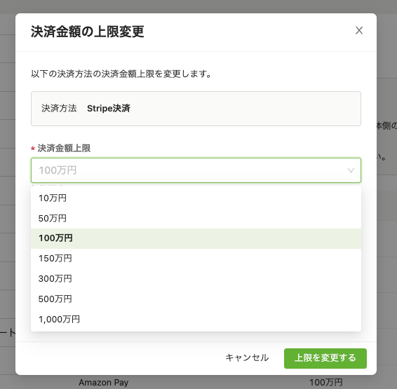 | Stripe決済 | 100万円 | • 10万円 • 50万円 • 100万円 • 150万円 • 300万円 • 500万円 • 1,000万円 |