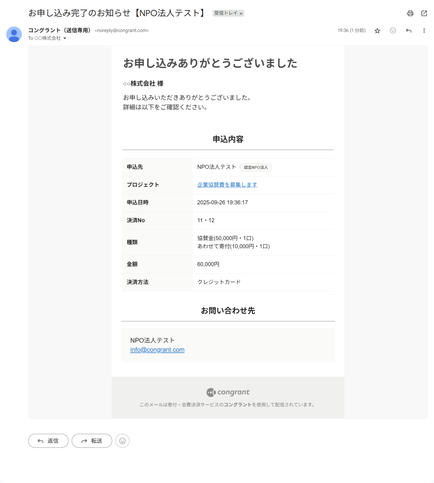 決済完了後のメールやサポーター宛のメッセージ、活動報告の更新通知など、コングラントからサポーター宛に送信されるすべてのメールに適用されます。