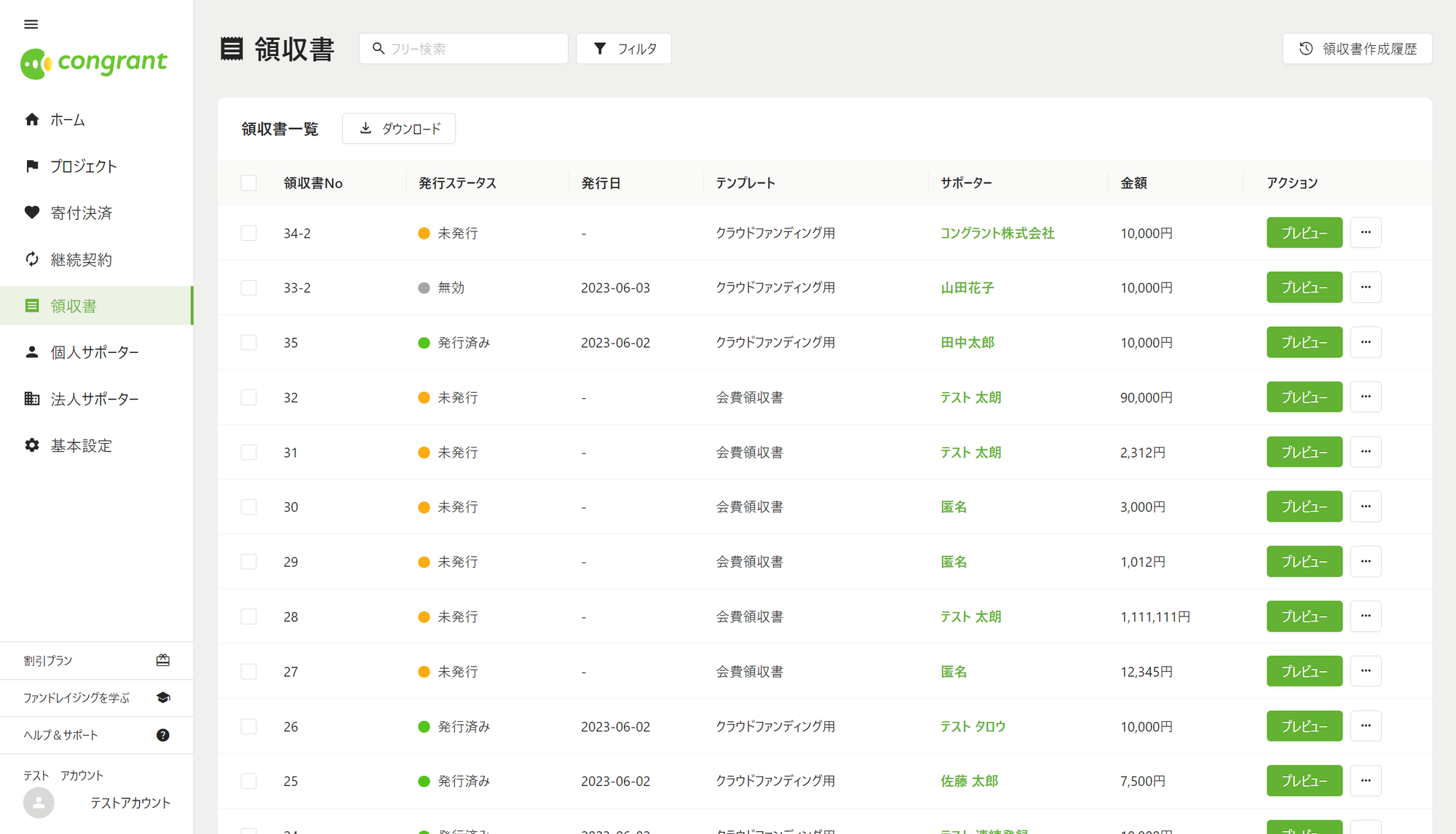 領収書管理では、コングラントで作成した領収書レコードの管理や送付ができます。